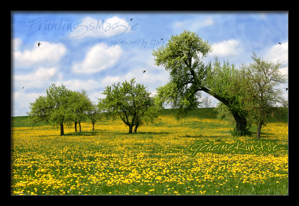 Unglaublich - diese vielen tausend Sonnen hier auf Erden vor unseren Füßen. - Es ist unglaublich. Innerhalb weniger Wochen expodiert die Natur voll Leben, voll ungebändigter, reiner und glücklicher Kraft. Alles spriest, blüht und strahlt mit dem Licht um die Wette - ist selbst das Licht. Die Schwalben sind da, die Schwalben sind da! Gaia hat, nachdem Sie uns hier über den Winter Ruhe zur Regeneration und zum Kräftesammeln geschenkt hat, nun soviel Energie, dass es an ein Wunder grenzt, mit welcher Macht die Energie von Gaia nun wieder zum Ausdruck kommt. Es lässt mich in Demut dankbar sein und wärmt mein Herz mit Zuversicht. Diese Kraft ist niemals vom Menschen zu bezwingen!